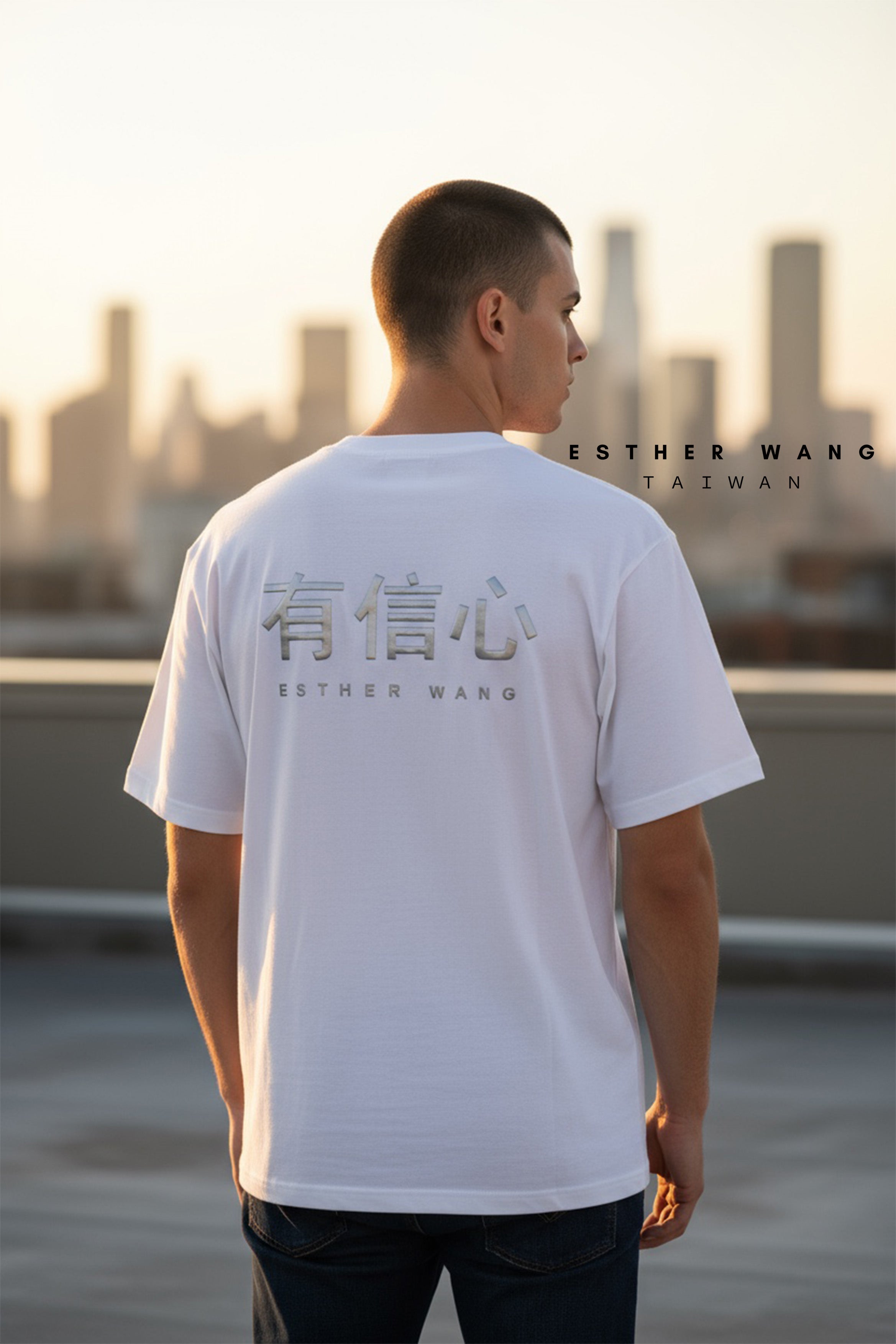 【Esther Wang】 EW 圓領精品刺繡印刷厚磅純精梳棉 T恤_白色_男女同款