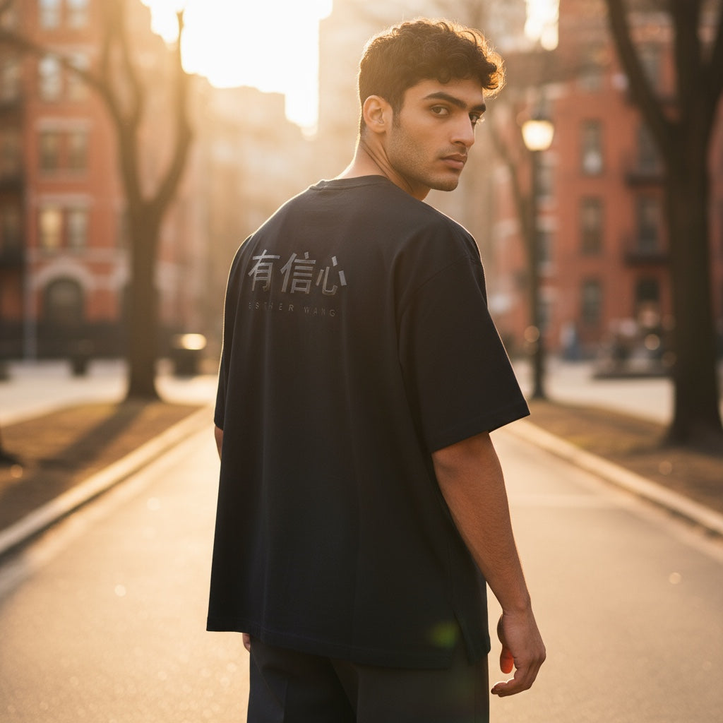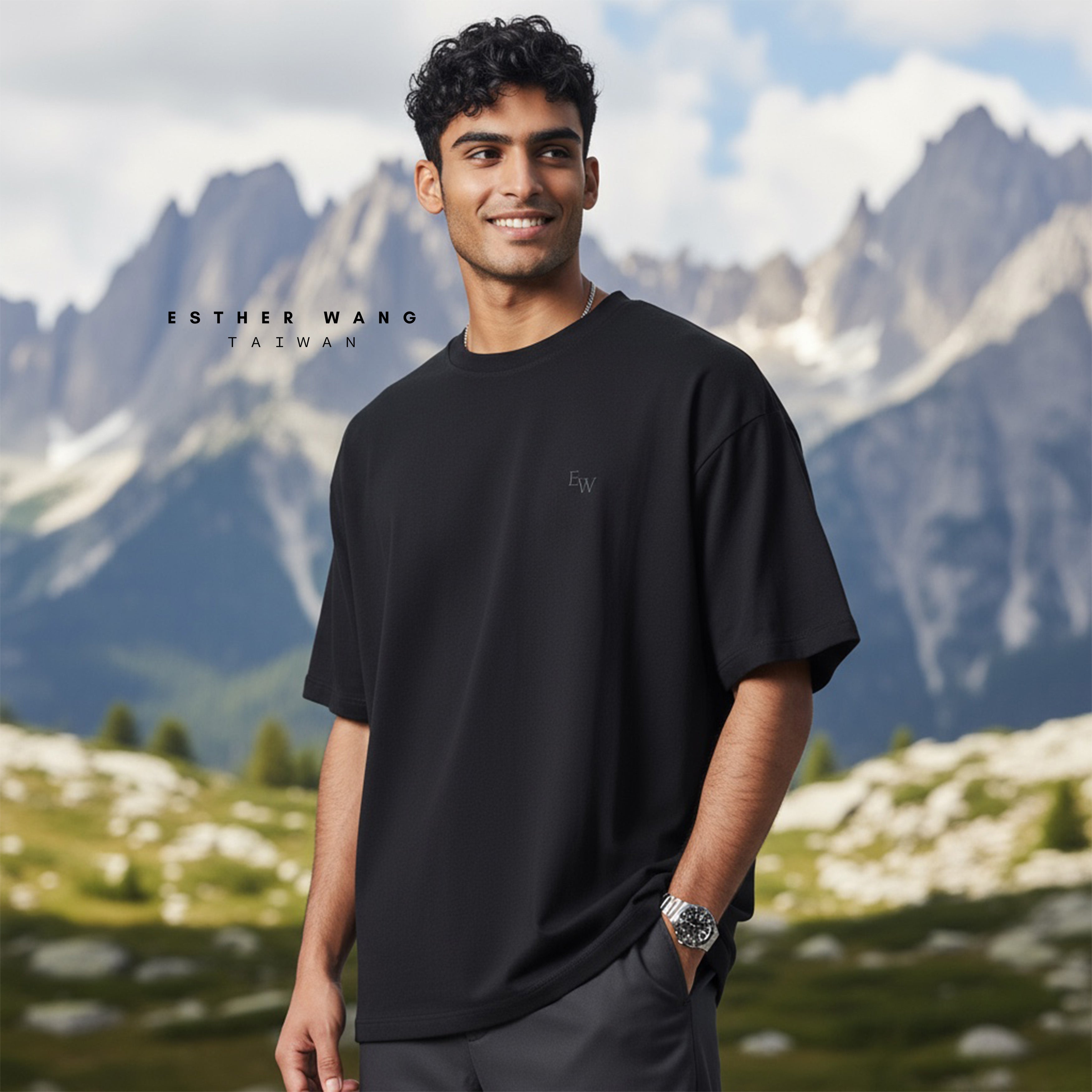 【Esther Wang】 EW 圓領精品刺繡印刷厚磅純精梳棉 T恤_黑色_男女同款